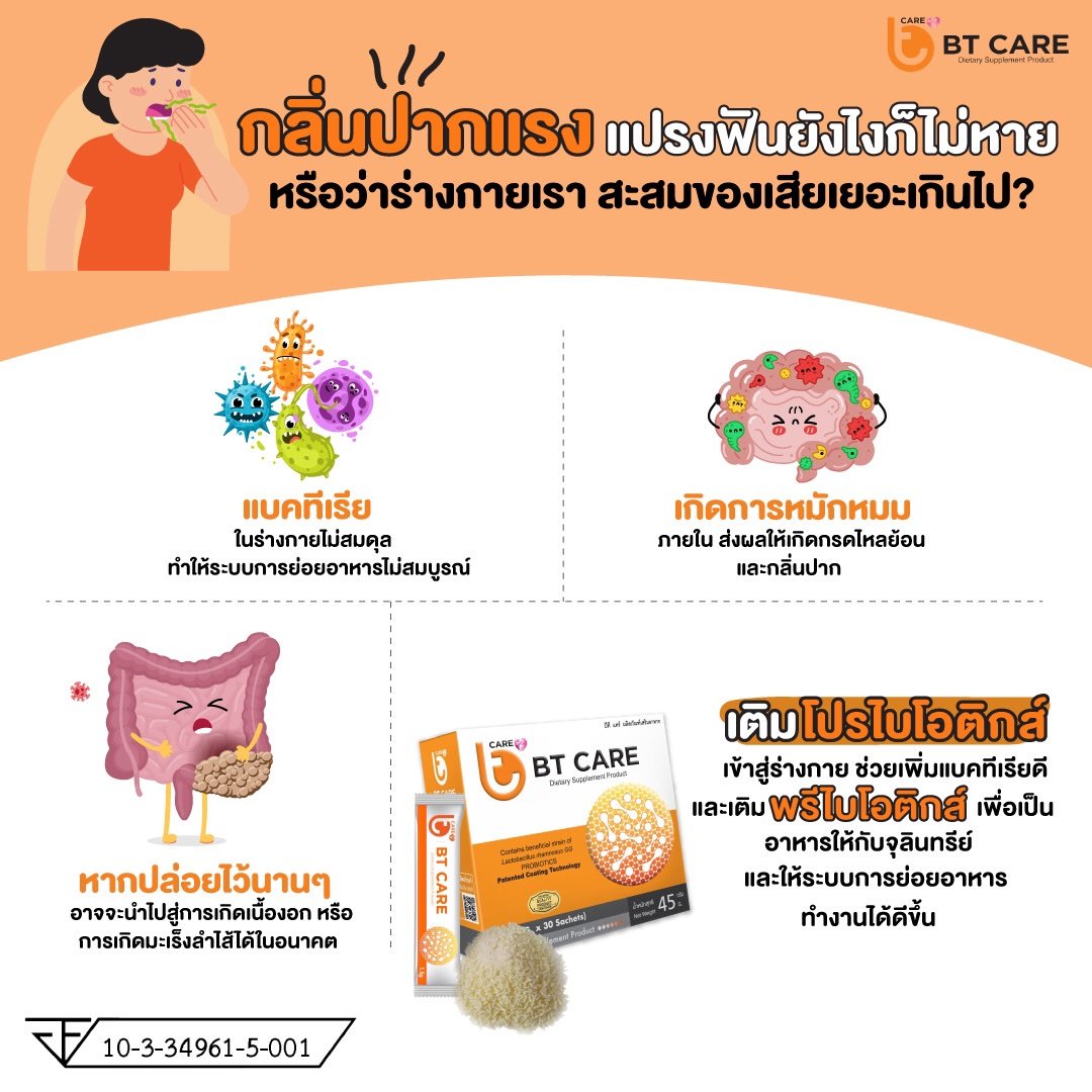 บีที แคร์ โปรไบโอติกส์ ผลิตภัณฑ์เสริมอาหารแบรนด์น่าเชื่อถืออันดับ 1 ของไต้หวันมานานกว่า 20 ปี มีโปรไบโอติกส์ "จุลินทรีย์ดี" ตัวช่วยปรับสมดุลลำไส้! จำนวน 18,000 ล้านตัว/CFU (ต่อซอง) และพรีไบโอติกส์ จึงมั่นใจในคุณสมบัติและผลที่ได้รับ